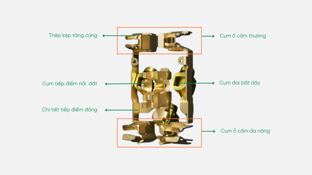 Cụm tiếp điểm bên trong ổ cắm Luso được thiết kế chi tiết bao gồm các bộ phận: