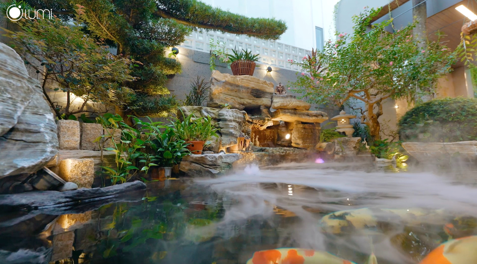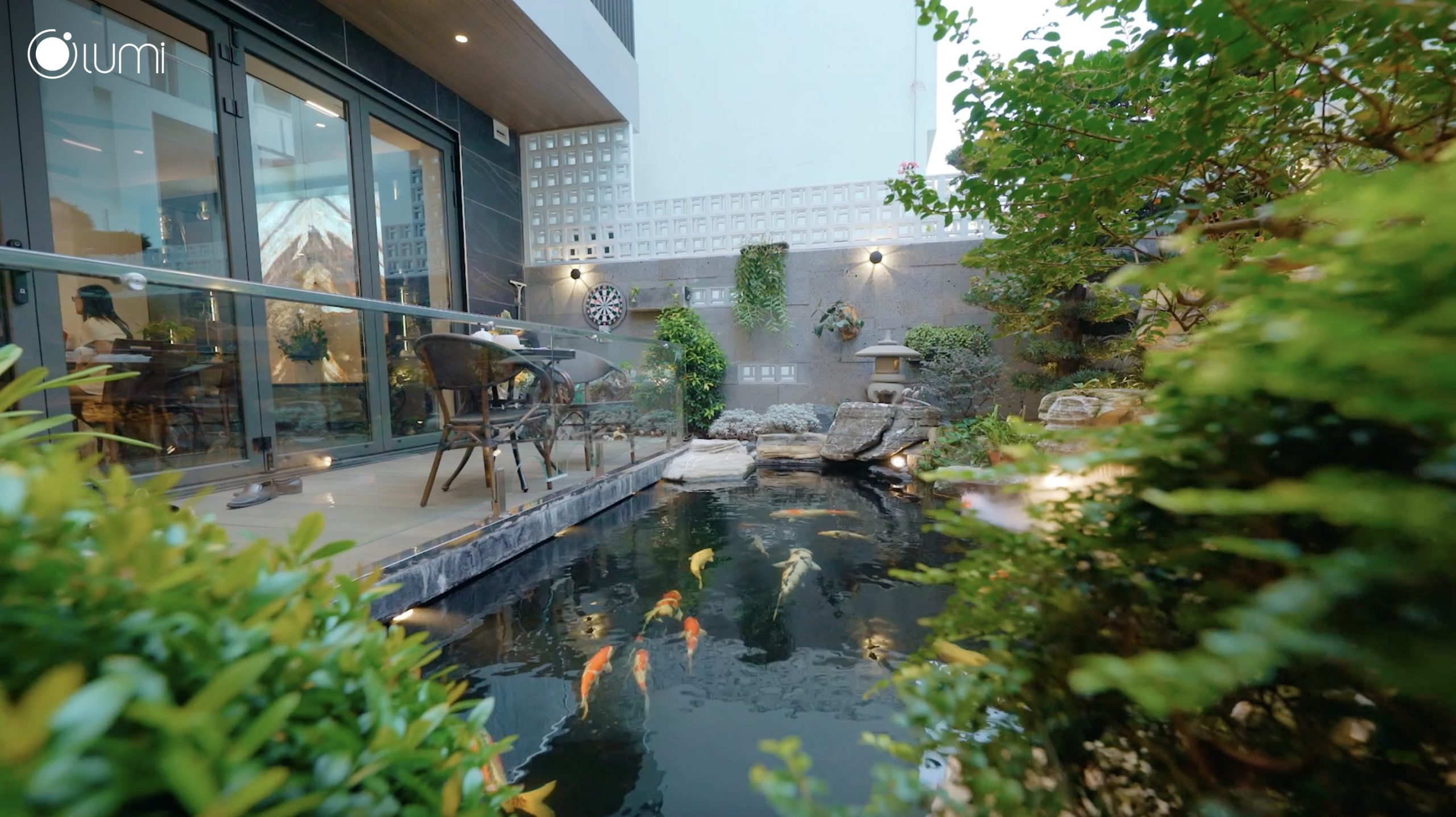 Bể cá koi được bố trí ánh sáng cùng thác nước tự động