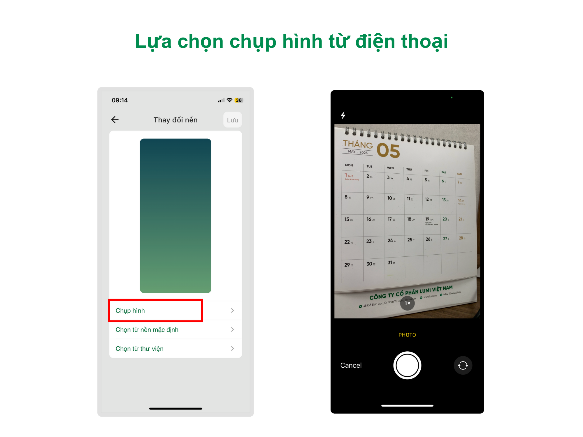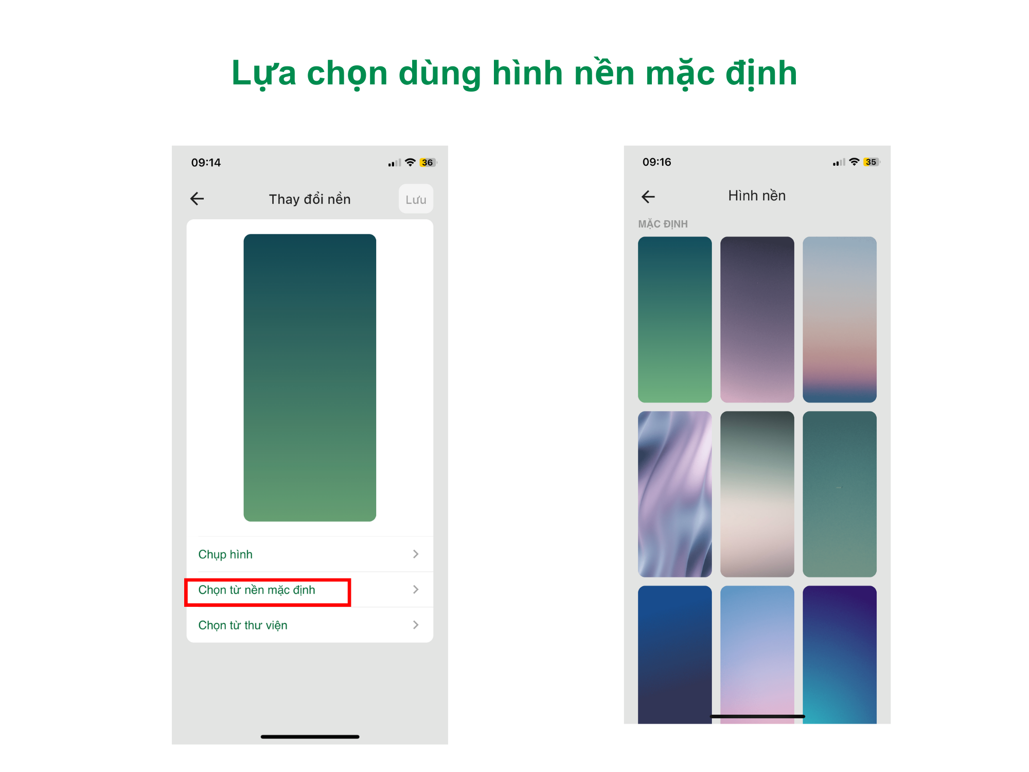 - Bước 2: Tại giao diện “Thay đổi nền”, có 3 lựa chọn dành cho bạn: sử dụng hình ảnh chụp trực tiếp, chọn hình ảnh mặc định và dùng ảnh đã có sẵn trên thiết bị. Ở mỗi lựa chọn này, chỉ mất vài giây để bạn có được hình nền như ý. Các thao tác đều vô cùng đơn giản, trực quan, thân thiện với người dùng.